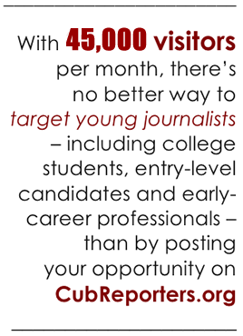 Complete the form below, or e-mail mark[at]cubreporters.org . It's FREE to post a journalism job, internship, fellowship, free program or scholarship on CubReporters.org. Please note: we do not list jobs or internships that provide no compensation (there should at least be a nominal stipend) nor will we post programs that charge fees. However, you may purchase an advertisement for $25.
